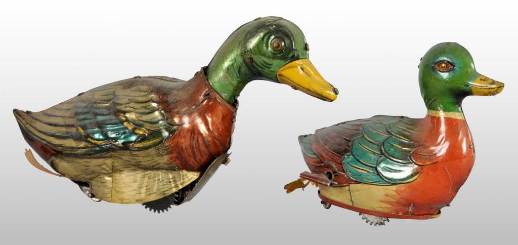 Description German. Working. One is made by Fischer with fish mark on bottom of toy and second is Hans Eberle marked "Tock-Tock" with "HEN" mark on bottom. Both have beautiful early lithography and very little wear. Condition (Excellent). Size Largest: 8" L.