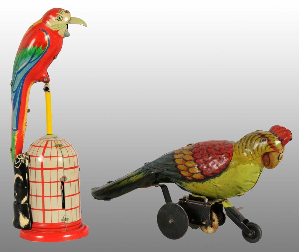 Description German. Working. Includes one three-wheel parrot that rolls along floor when wound with some green painting on belly that may or may not be factory and one parrot marked on bottom "Made in Germany #659". Second toy has a very unusual mechanism. When wound, parrot spins around perch while cat periodically leaps up and tries to bite his tail and smaller parrot pops out of the other side of the cage. Condition (Excellent). Size Largest: 9" T.