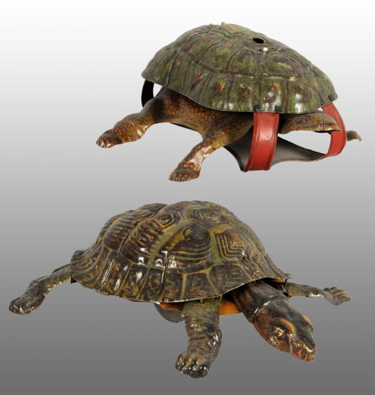 Description German. Working. One is marked "Made in Bavaria" which winds up on the bottom. When wound, toy crawls while tail wiggles. The second toy winds up on the top and when wound, the shell moves up and down. Beautiful lithography with minor wear to both. Condition (Excellent). Size Both: 8" L.