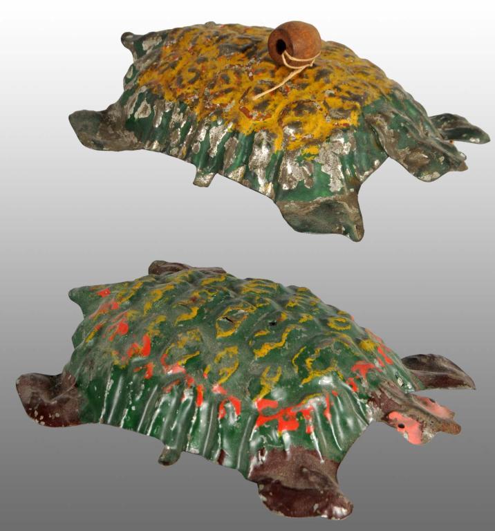 Description American. Operated when string on top is pulled. Appears to be two different versions of the same toy in different paint combinations. There is a patent mark on the top of the shell and one turtle is missing its ball and pull string. Condition (Very Good - Excellent). Size Both: 7" L.