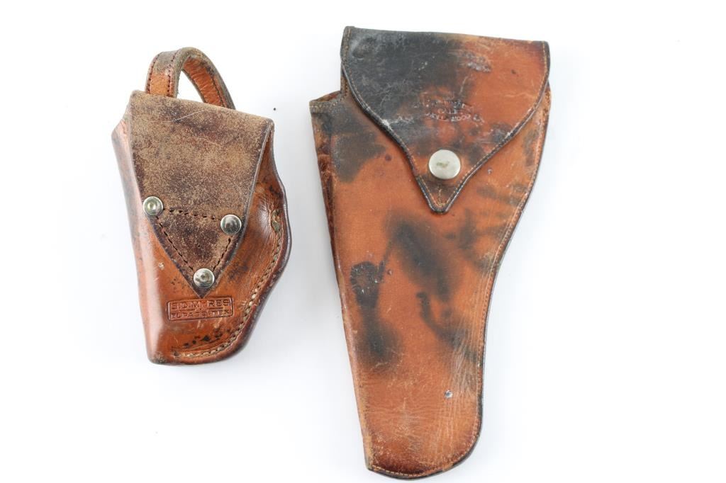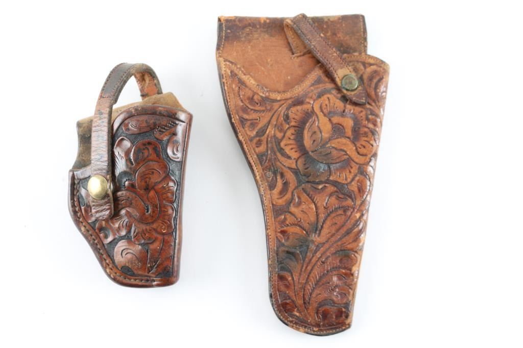 Bohlin made brown tooled single holster maker marked. And a smaller SD Myres brown tooled holster.