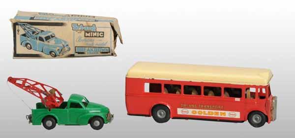 Description English. Working. Includes one plastic and metal breakdown tow truck marked "Minic" on bottom and one friction transport bus with stickers on both sides. Includes original box for breakdown truck but is missing two flaps. Condition (Very Good). Size Largest: 8" L.