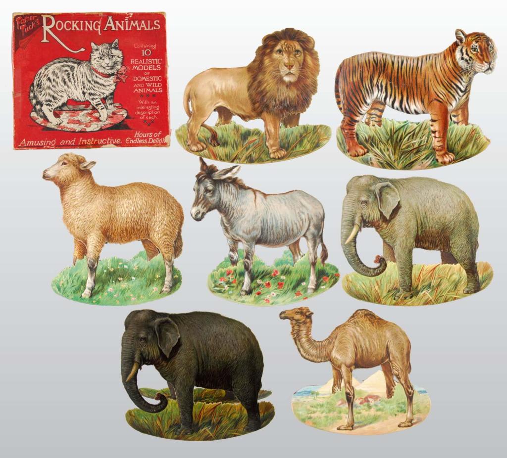 Description Circa 1920s. The boxed set includes ten domestic and wild rocking animals. All the rocker pieces are attached. The box is in poor condition, but the set is very good. Also included, "Noah’s Ark" with twelve animal pairs in good condition.