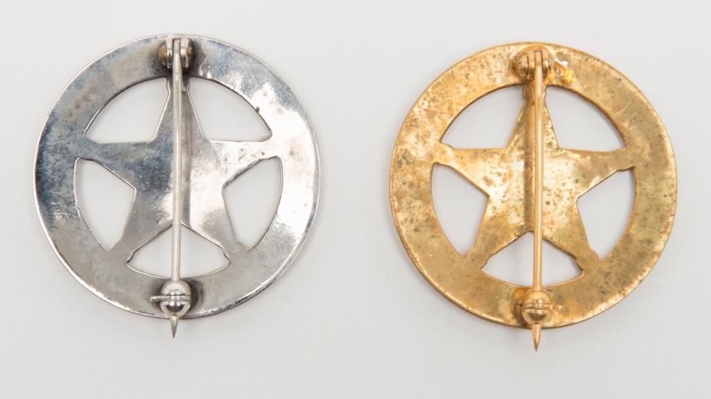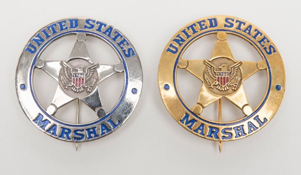 Lot of 2 U.S. Marshal badges, one in nickel color the other in gold color with enameled lettering, no maker markings on reverse sides. Est.: $300-$600