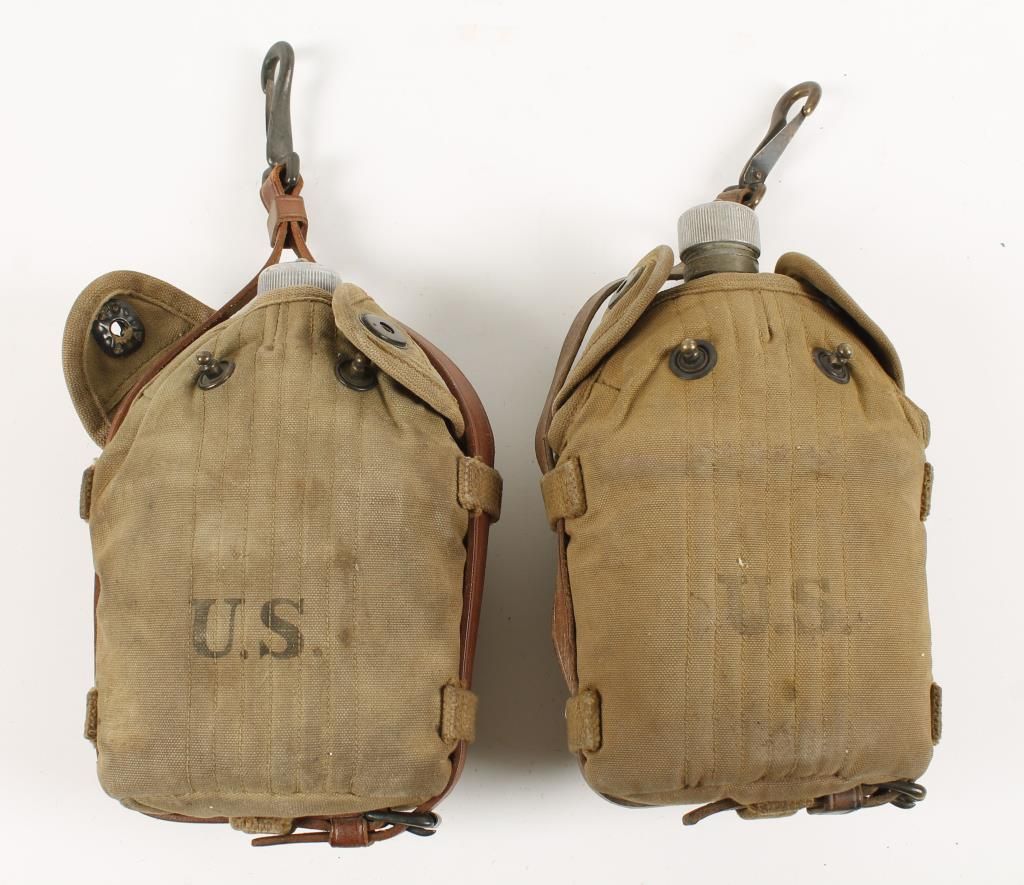 (1) Canteen With cup, cover, and hanger. Canteen and cup both marked "US AGM Co 1918". Canteen still has original lid and chain, cup retains handle. Cover marked inside "Long 2 18" and outside "U.S.". Leather wraparound strap and metal hanger with no visible markings. (1) Canteen With cup, cover, and hanger. Canteen stamped U.S. ACA 1918", with seam, concave back, and lid on chain. Cup with folding handle, stamped U.S. L.F. & C. 1918". Canvas cover marked "U.S." with wrap around leather strap with metal hanger, probably 1917 model.