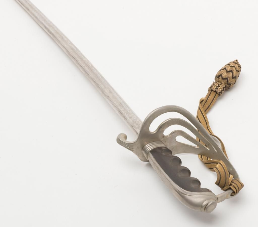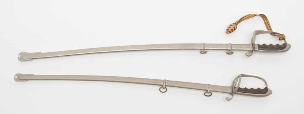 Lot of 2 U.S. swords and scabbards; first has no maker mark, is approx. 36” overall with etched blade, “US”, stands of flags motifs, etc.; blade is near fine, scabbard shows frosted nickel finish; second sword is by Pasquale Co., SanFrancisco and also has an etched blade with “U.S.”, stand of flags, spread eagle, cannons, etc., in very good condition with frosted nickel finish to scabbard; also gold threaded hanger knot; per consignor’s notes, Major A.V. Hennessyfrom enlisted members Dept. Hospital Honolulu T.H. June 25, 1918. Est.: $300-$600.