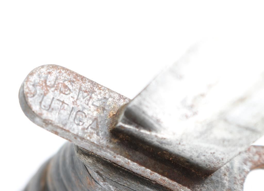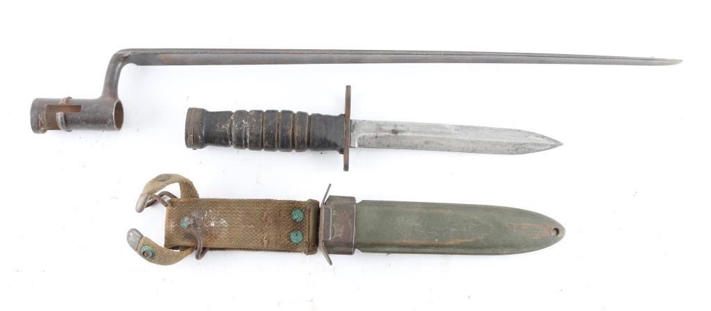 1) Utica M4, stacked leather handle, fair or better condition with much thin rust. M8 scabbard. 2) US marked triangular socket bayonet, fair condition.