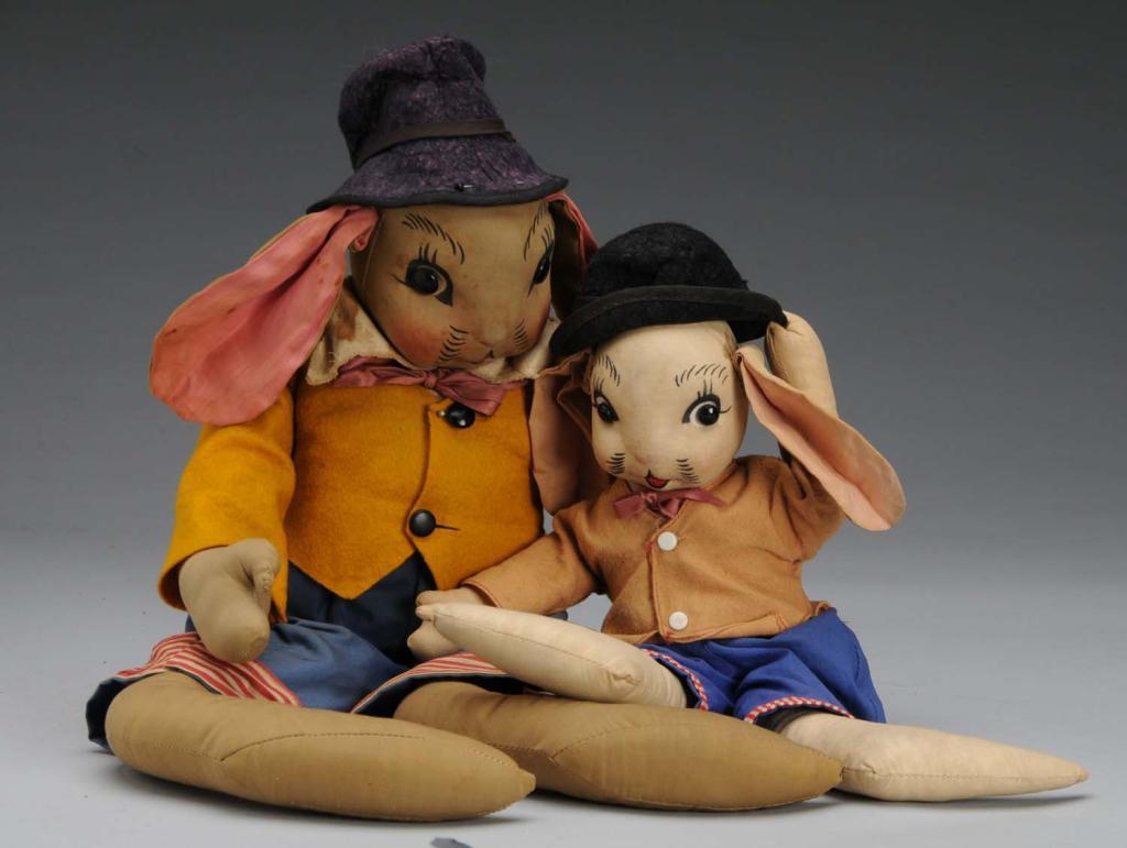 Very similar clothing and hats are all original. Jacket and ears are faded on the small of two dolls. Both are unmarked. Scarce. Condition (Very Good). Size Largest: 16" T.
