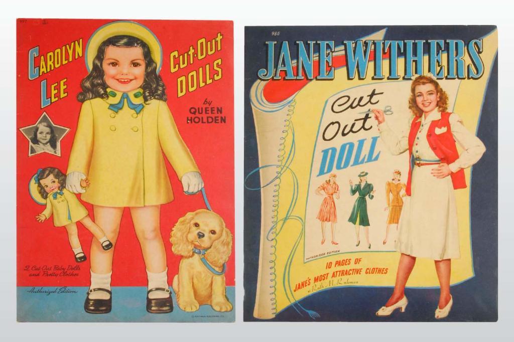 Description Dated 1941. The "Jane Withers" book, 10.5" x 13", Whitman #986, has one doll that is separating from the cover and ten pages of vintage clothing. The cover has spine wear, color chips and age. Dated 1943. The Carolyn Lee book, 10" x 14.75", Whitman #997, has two dolls and six clothing pages. Despite color scrapes on front/back covers and minor foxing, both books are in good condition.