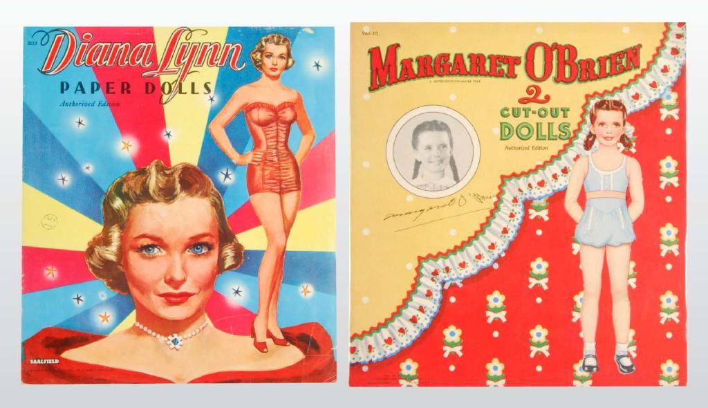 Description Dated 1946. The 11" x 13" "Margaret O'Brien", Whitman #957, has two dolls and six pages of vintage 40s clothing in fine condition with minor cover wear. Dated 1953. The 10.5" x 11.5" "Diana Lynn" book, Saalfield #2611, has two dolls and four clothing pages. The book has minor cover wear with imperfections.