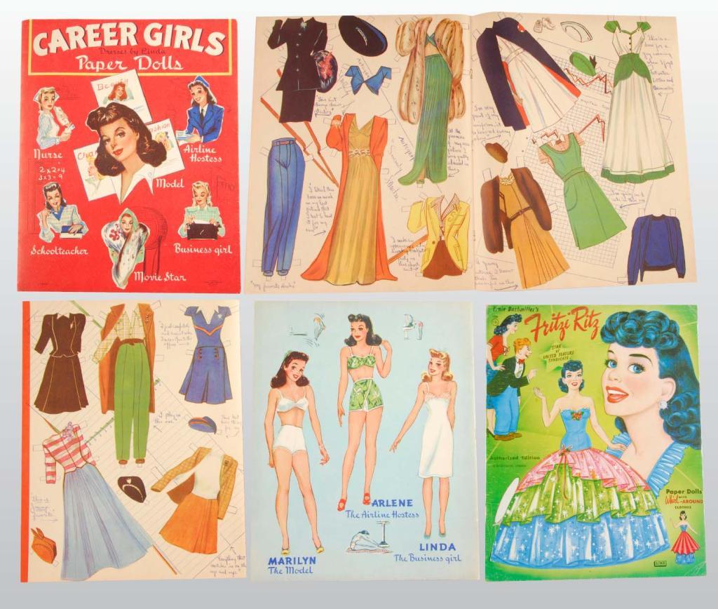 Description Dated 1941. The 11"x14" Lowe book "Career Girls" has six dolls and six pages of acceptable fashions for a 1940s working woman. There are color chips and other wear and the book is fragile. The second book in this lot, "Fritzi Ritz" has two dolls and four clothing pages suitable for the 'star of united Feature Syndicate'. There are several minor cover flaws. Two terrific books!
