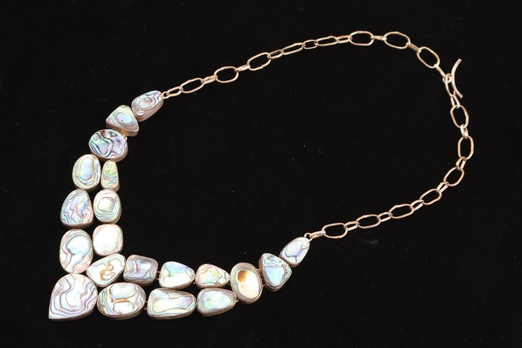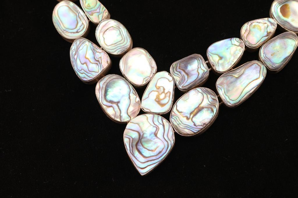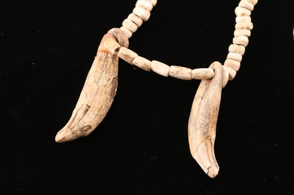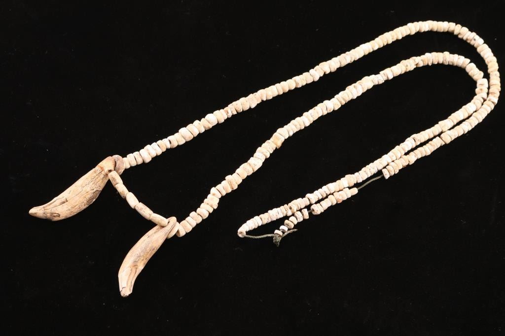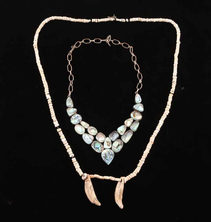 One is a Native American bone necklace with two very old bear claws. Contains a note stating is is from the Woodland Period unearthed by "Foster". The other is modern and made from abalone and brass.