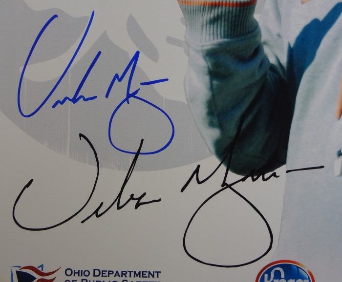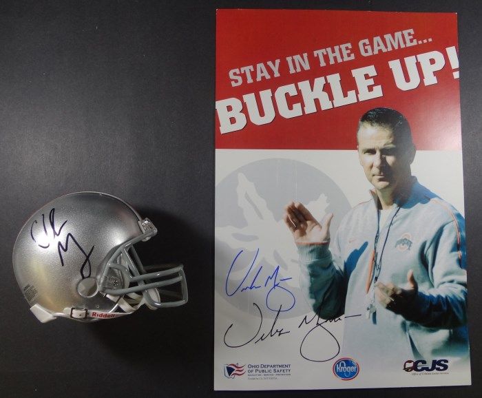 OSU Mini Helmet Signed by Urban Meyer with black sharpie. Stay in the Game... BUCKLE UP! 11 x 17" Poster (Kroger) Signed by Urban Meyer with black sharpie. No COAs. Est. Value $155.00 - $175.00.