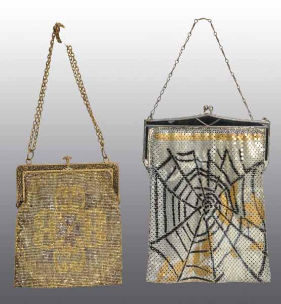 Description Includes one French metal beaded purse and one Whiting & David purse with a spider web design and minor enamel loss on metal top. Condition (Excellent). Size Largest: 6" L.