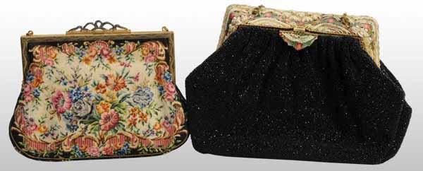 Description Includes one black beaded French purse with enamel and seed pearl work at top and one tapestry purse. Both are clean. Condition (Excellent). Size Largest: 6" x 7".