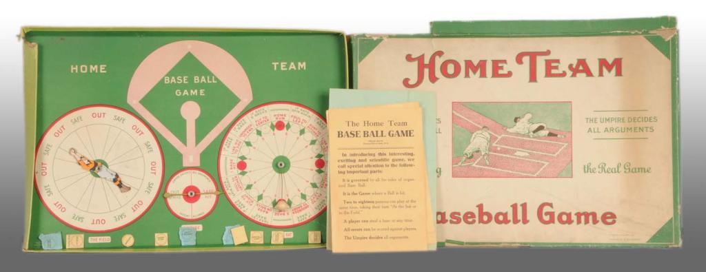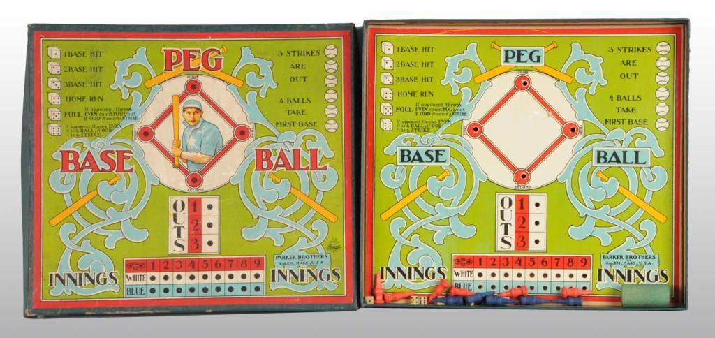 Description Includes one Home Team Baseball game copyright 1917 with instruction sheet, spinner, and cardboard play pieces. Also includes one 1920s Peg Baseball game by Parker Brothers with seven dice, dice cup, six red pegs, and six blue pegs. Includes both original boxes, one with staining and torn aprons. Condition (Excellent). Size Largest: 12" x 18".