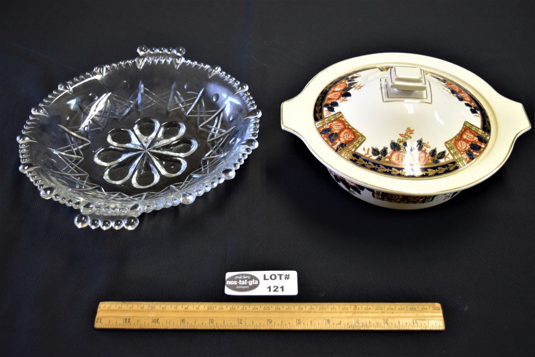 T Hughes Windsor Derby Covered Serving Dish (sm chip-inside lid) and Press Glass Fruit Bowl