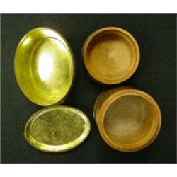 Vintage boxes. Lot of 2. 1) Oval tin covered in velvet and old ribbon. Scene of old German town. The bottom says Atido Handarbeit Berlin - c 1920-30. 2) Round wood box with hand painted designs. Illegible marks on inside of lid and bottom. It appears to be Eastern European. Condition: Very Good