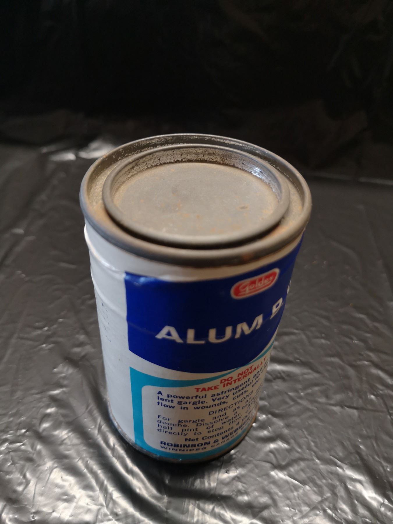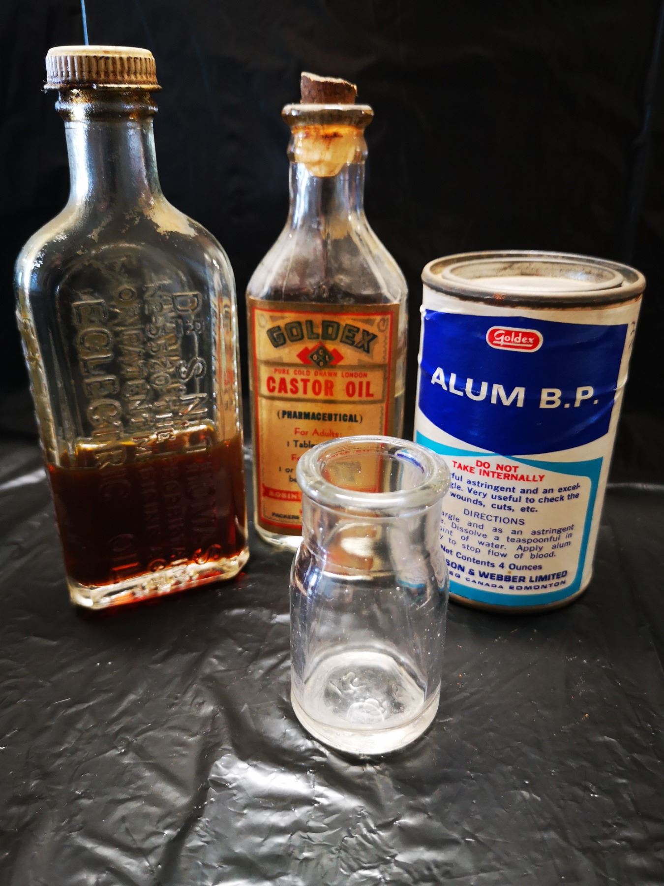Lot of 2 Vintage Medicinal Bottles, 1 Small Tin of Alum BP and Small Glass Bottle