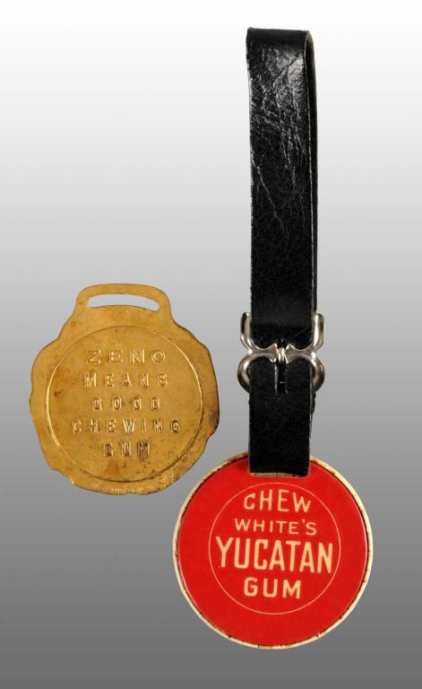 Description One is for Zeno with a Greek God-like character on front. Another is celluloid for Yucatan gum with leather strap that appears to be original. Both have some wear and dirt. Condition (Very Good - Excellent). Size Largest: 1 - 5/8" Dia.