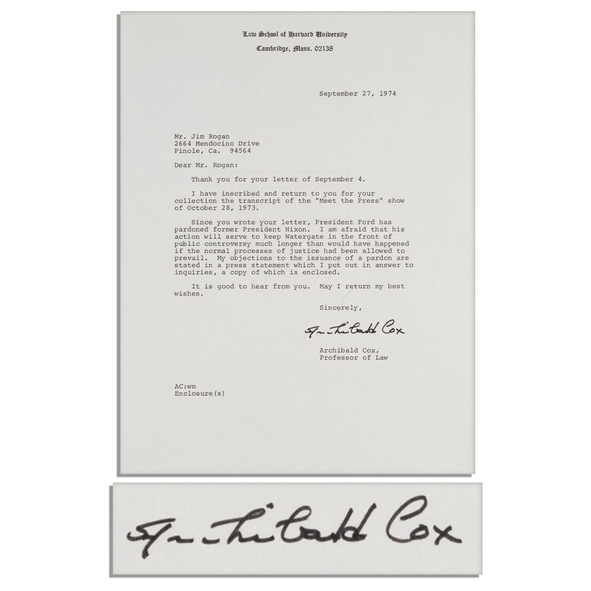 Pair of Watergate typed letters signed by Archibald Cox and Elliot L. Richardson. (1) Cox writes on Law School of Harvard University letterhead, datelining his letter Cambridge, Massachusetts, 27 September 1974. Single-page letter to Jim Rogan reads in part, ''...President Ford has pardoned former President Nixon. I am afraid that his action will serve to keep Watergate in the front of the public ...'' Measures 8.5'' x 11''. Near fine. (2) Elliot L. Richardson typed letter signed. Upon his personal stationery, the former Nixon cabinet member, who resigned rather than obey Nixon's request to fire special prosecutor Archibald Cox, writes, in part, ''Nixon's resignation was in his own, as well as the country's best interest...'' Datelined Washington, D.C., 16 September 1974, letter measures 8.5'' x 11''. Near fine.