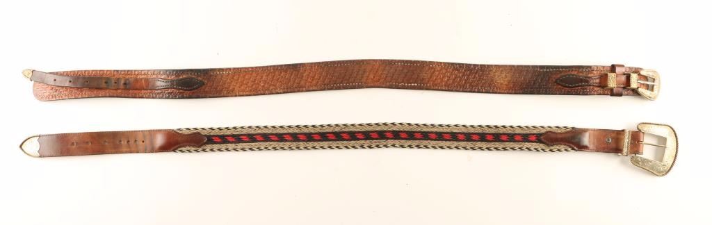 (1) Hand tooled Leather belt & buckle. Measures 39 3/4" long overall by 1 13/16"w. Has a nickel plated brass belt buckle with brass keepers all with rope trim and a floral motif. (1) Braided belt with leather and belt buckle. Measures 41 3/8" overall by 1 1/2"w. The hand engraved belt buckle is maker marked 'Montana Silversmiths German Silver Columbus Mont'. The keepers are also hand engraved with scroll and floral motif.
