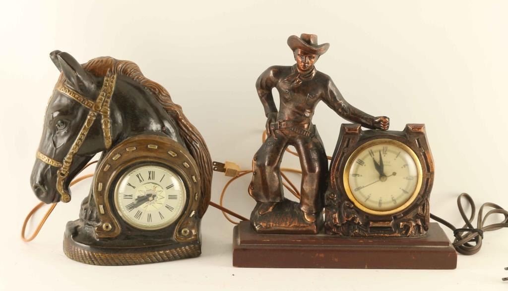 (1) Electrified Horse Clock ceramic construction (non-working) (1) Electrified Cowboy clock made by United metal construction on wood base (non-working