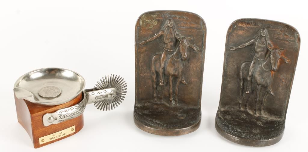 Includes (1)pair of Southwestern solid brass heavy book ends that have the figure of an Indian Chief on horseback molded on the ends, and a Southwestern engraved silver trophy spur with Mexican style pointed rowel spur mounted on a wood heel shaped block, on top of the block is a silver tone change keeper saucer with a Chile coin glued to it, a small bronze plate is inscribed "Gift From Frida.