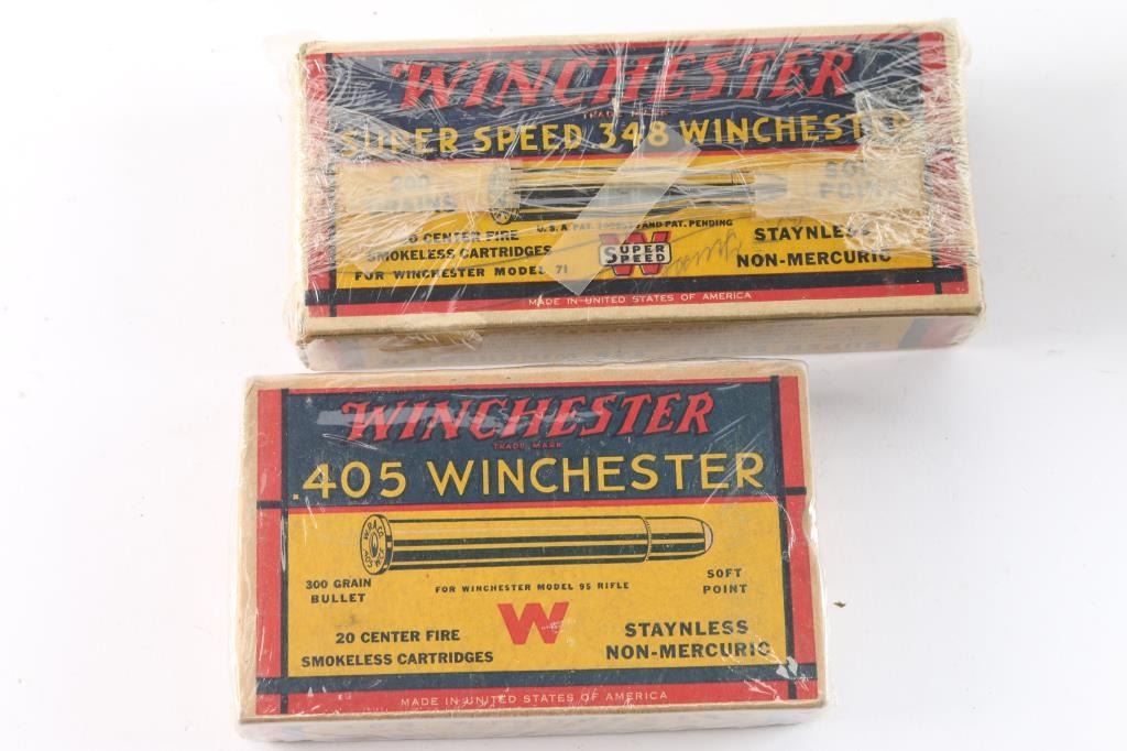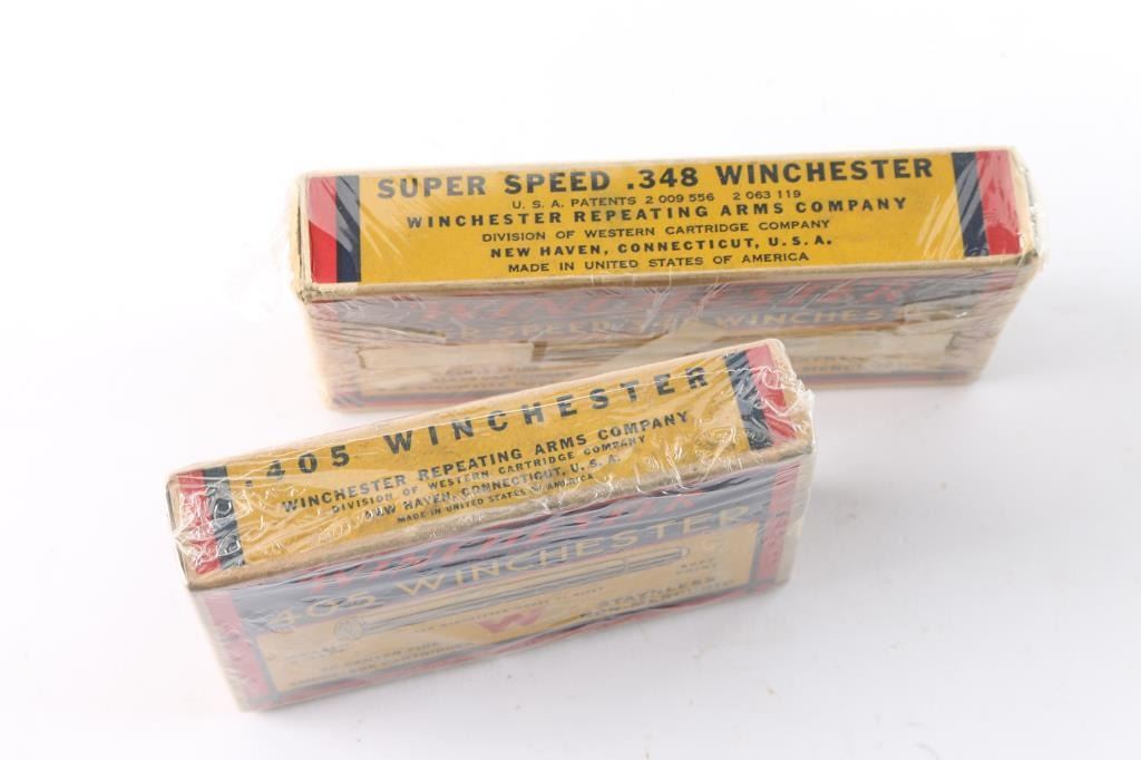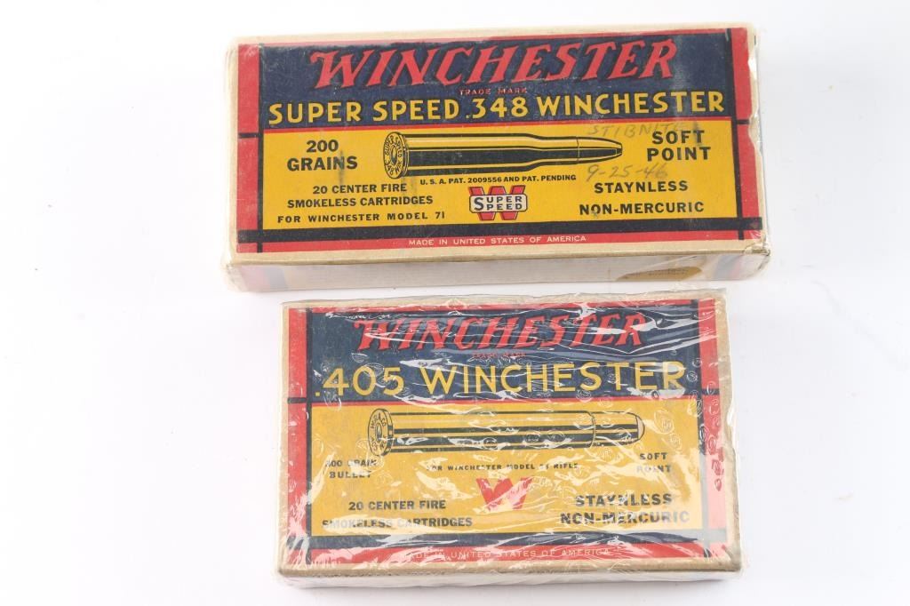 With pictured cartridges: A. 405 Winchester 300 grain soft point stainless non mercuric for 95 rifle. B. 348 Winchester super speed, stainless, 200 grain soft point. Both very good plus. 8.5 on 1-10 scale.