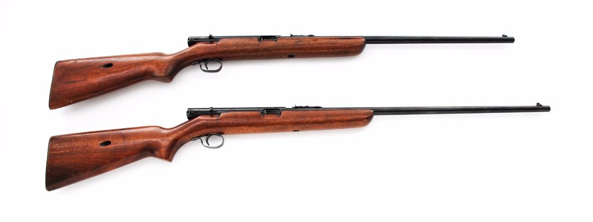 Lot of Two (2) Winchester Model 74 Semi-Automatic Rifles: (1) #137392, .22 LR cal., 24'' barrel, blue finish, smooth pistol-grip walnut stock, checkered metal buttplate, with standard sights. Mfg'd 1946. Condition is very good overall retaining approx. 92% blue, with thinning and wear at the muzzle, as well as general light to moderate scuffs, scratches and some fine surface rust that should easily clean. Stock with a considerable amount of scratches and bruises. Action is crisp, bore is fine. (2) #165380A, .22 LR cal., 22'' barrel, blue finish, smooth pistol-grip walnut stock, checkered metal buttplate, with standard sights. Mfg'd 1947. Condition is good overall retaining approx. 65%-70% thinning and toning blue. Stock with a considerable amount of scratches and impressions. Action is excellent, bore is fine. Est.: $300-$500/lot. (C&R)