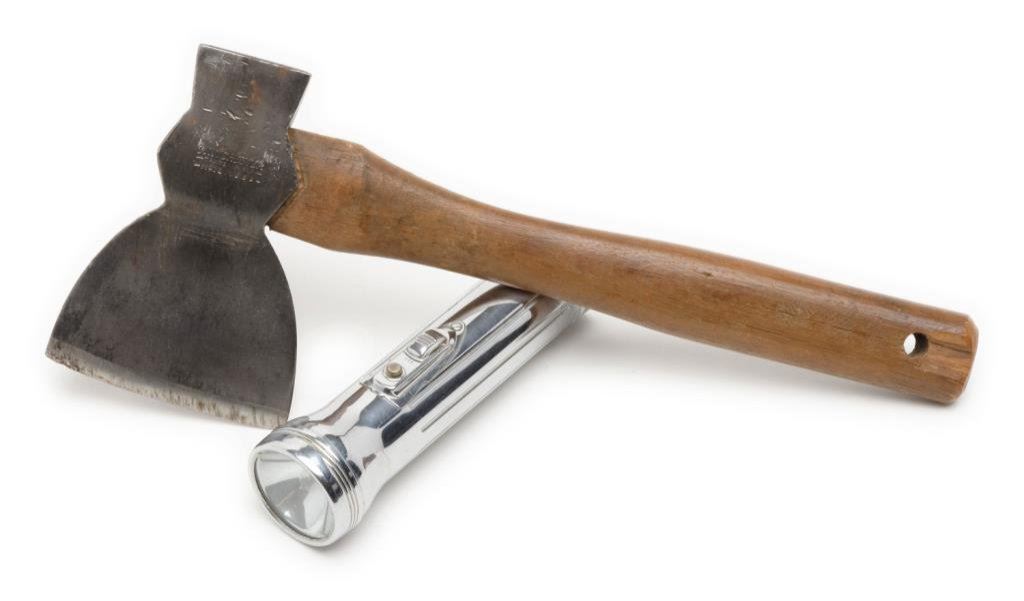 Lot of 2 Winchester collectibles including a Winchester-marked flashlight, approximately 7” in length in overall very good + condition and a Winchester-marked hand axe, also in overall very good condition. Est.: $125-$175.