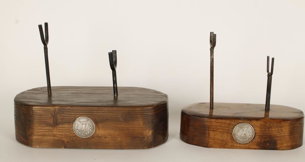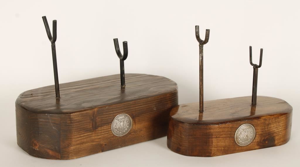 2 Stained Wooden Stands With Metal Gun Holders, On The Side Of Each Is A Silver Metal One Dollar Coin.
