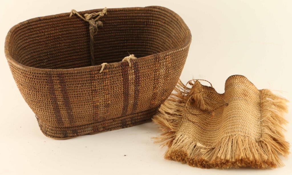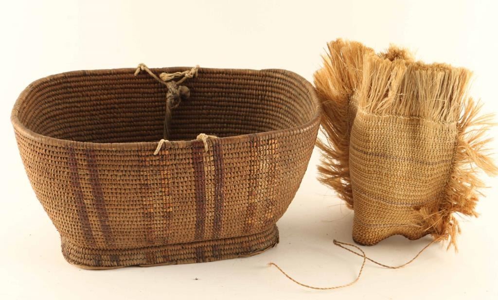 Fraser River footed rectangular basket circa 1920 measures 6"x8"x12" losses to foot of basket otherwise good and a woven and fringed bag, possibly South Pacific circa 1940 good condition, handle has broken.