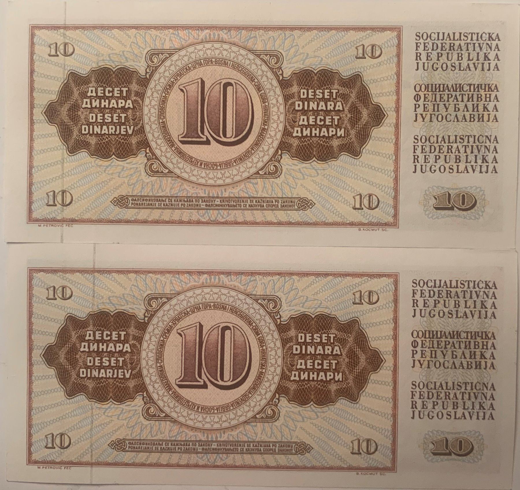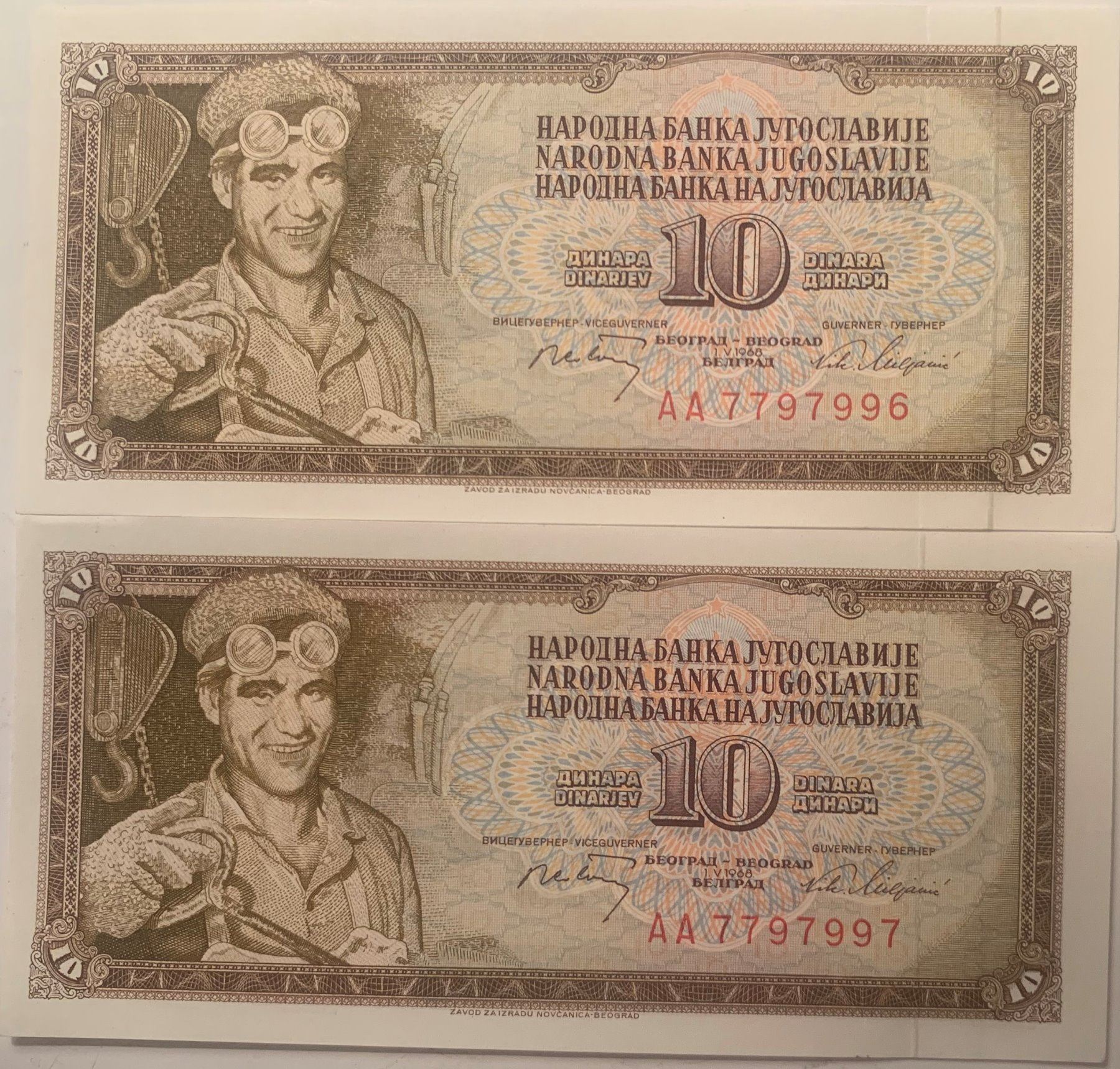 Lot of 2 Yugoslavia 10 Dinara 1968 P 82 AUNC Sequential Serial AA7797996 to AA 7797997