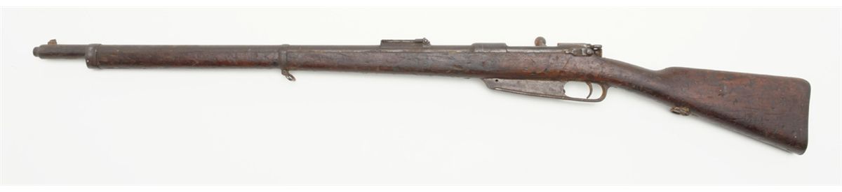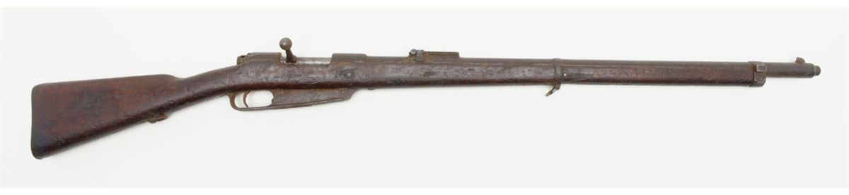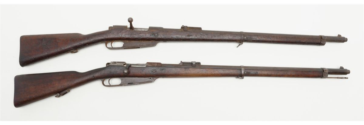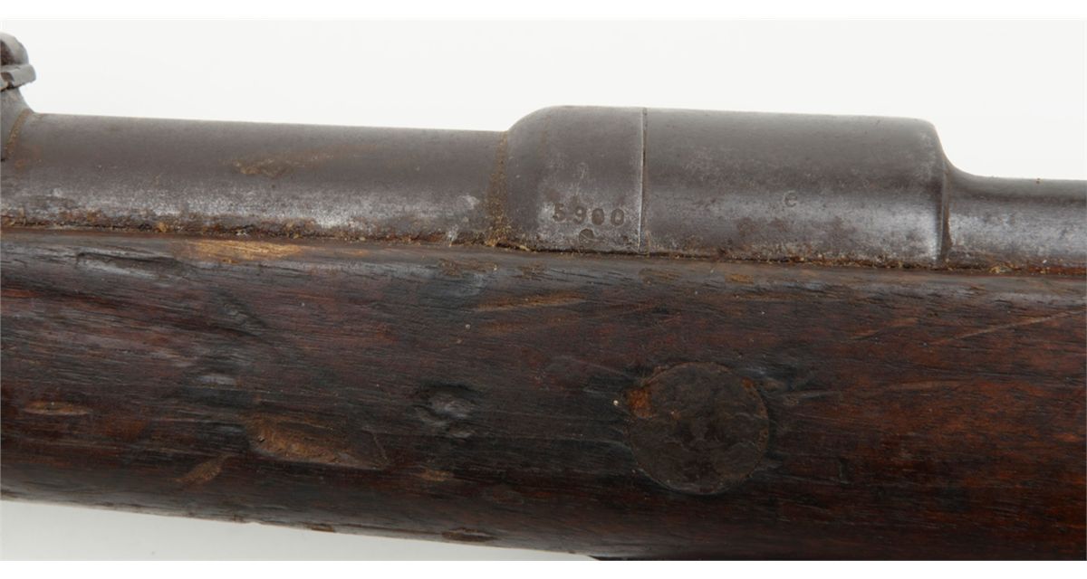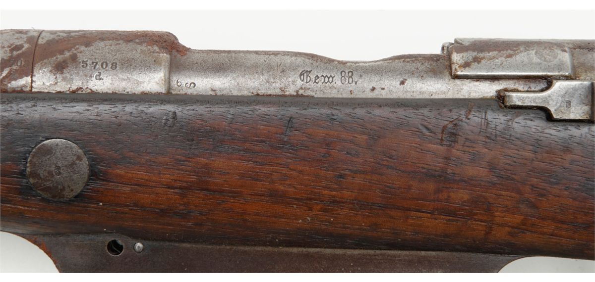 Lot of 2 antique European bolt action rifles including an 88 Mauser bolt action rifle, #5708d in un-cleaned fair to good condition with traces of blue in protected areas, sluggish action, good wood and scattered surface rust and grime from years of storage; also another 88 Mauser, #5900 in working un-cleaned but rougher condition showing a heavy dark patina to metal surfaces, dark bore, considerable grime and surface rust, wood heavily marred and scratched from years of carry and storage; missing cleaning rod. (Antique). Est.: $125-$250.