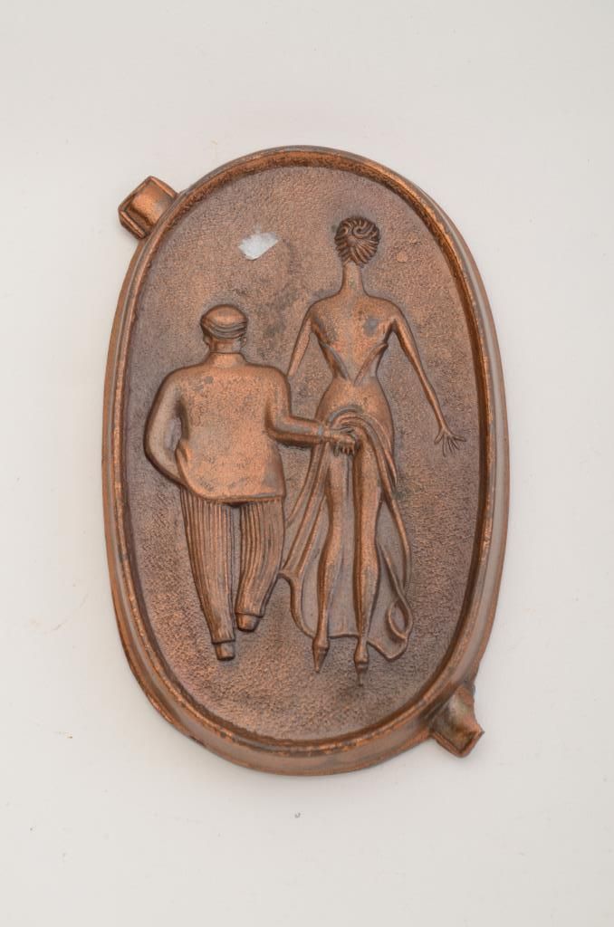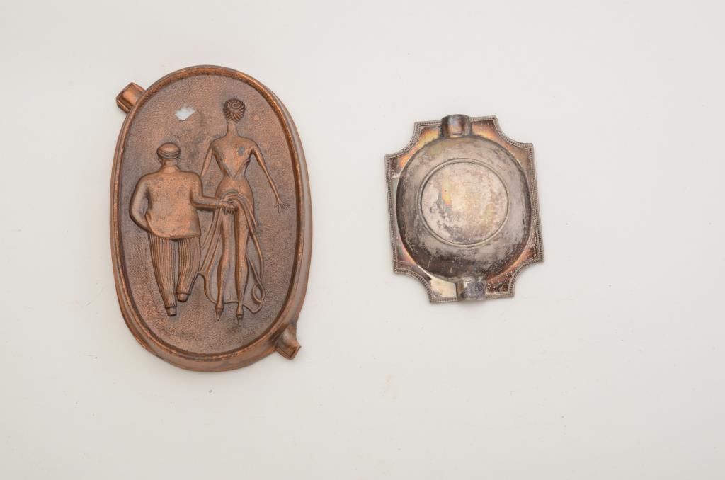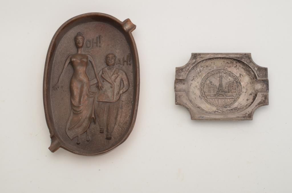 Lot of 2 antique metal ashtrays; one showing a man and woman, approx. 6” x 3-1/2”, slight old damage to one cigarette rest; the other shows a design in the bottom of the Eiffel Tower and is approx. 3” x 4”. Est.:$50-$75.
