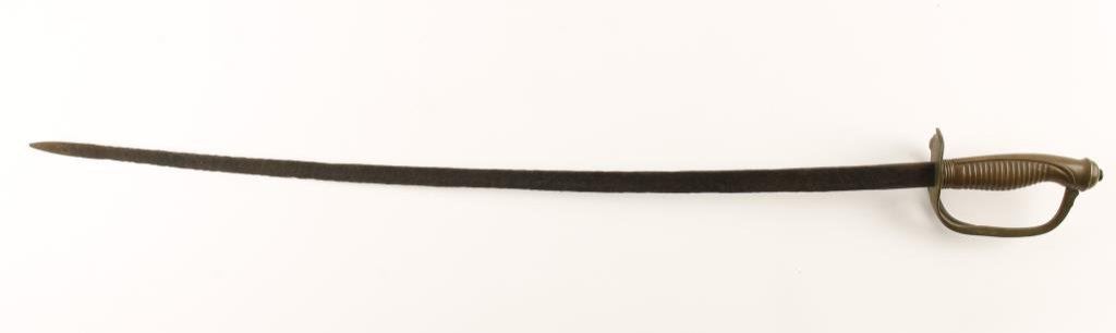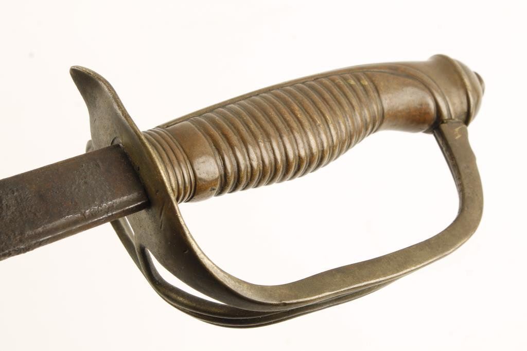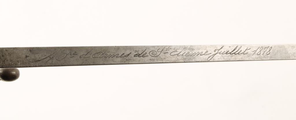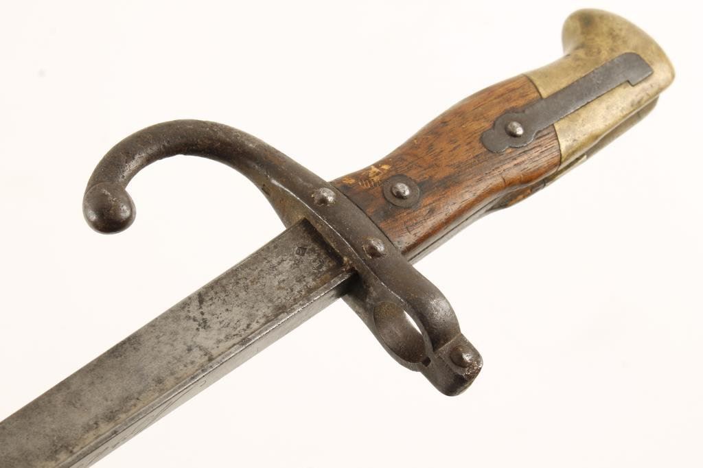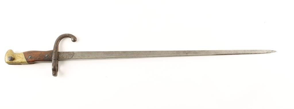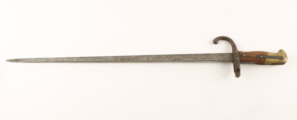 Lot of 2 bladed weapons; one a European cadet sword (no sheath) and a gripped bayonet; sword is heavily pitted on the blade, bayonet is overall good. Est.: $100-$200.