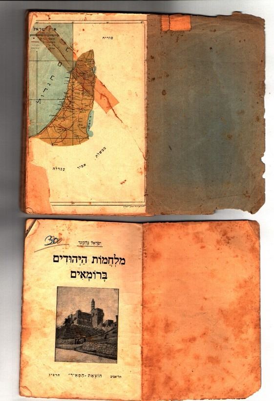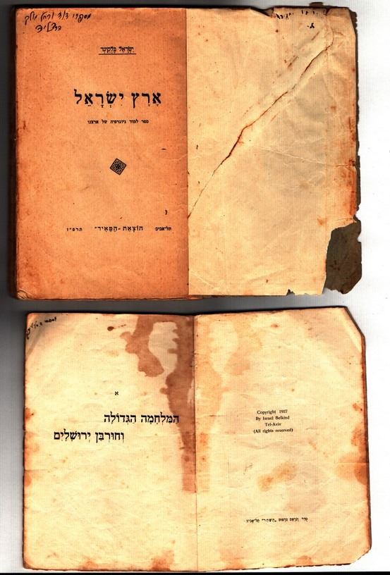 Lot of 2 books on Eretz Israel in the writings of Israel Belkind, 1927, and published by Hameir Press, Tel Aviv: 1. The Jewish Wars Against the Romans [Hebrew], paperback, 51 pages. In reasonable condition: worn bindinge, slightly damaged spine, stains, 2. Eretz Israel: A Geography Textbook [Hebrew], worn and faded binding, first page: left corner missing, stains along pages and page edges.