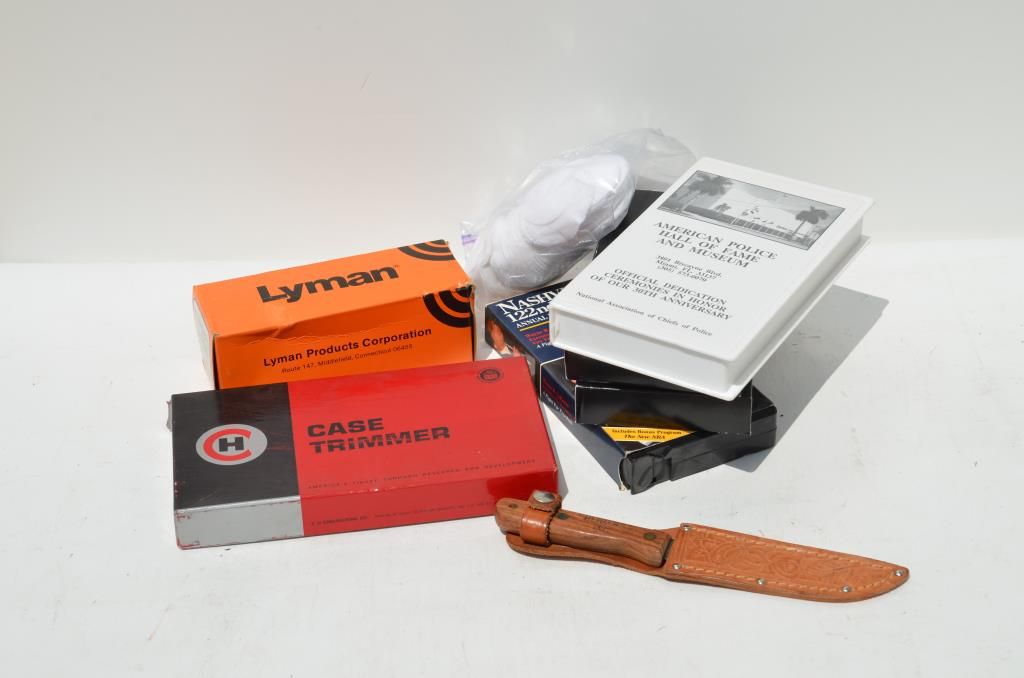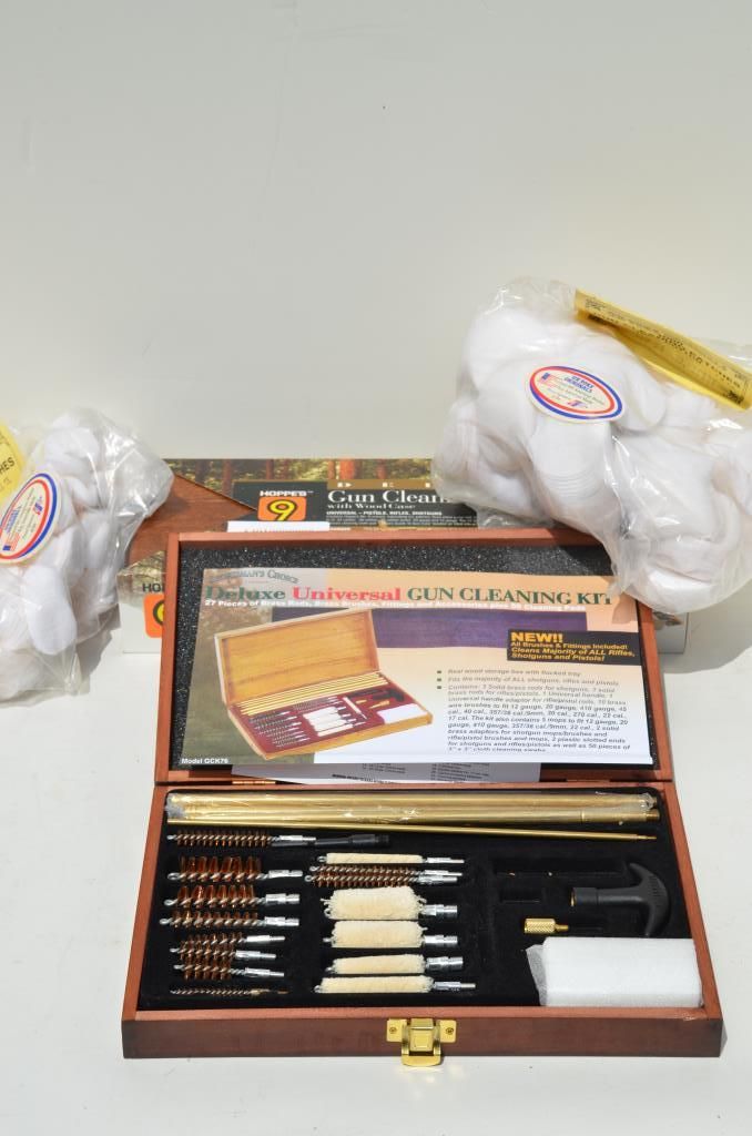 Lot of 2 boxes of gun cleaning supplies and cleaning kits; good for the workshop or for the gun show circuit as additional part out sale material. Est.: $100-$200.