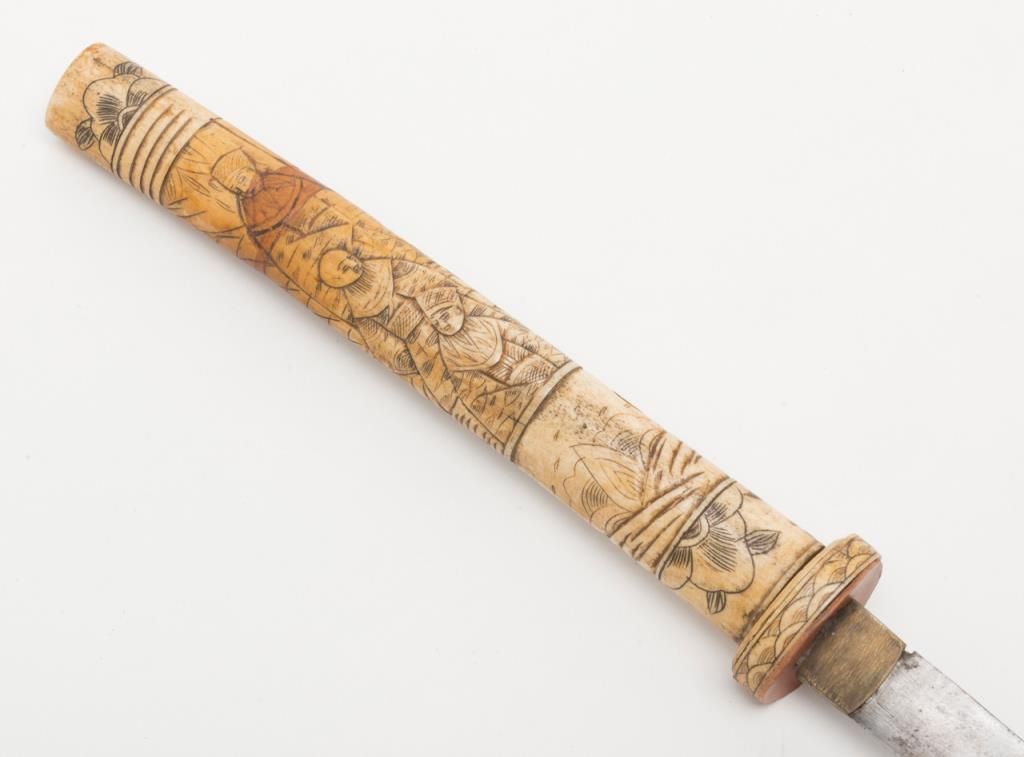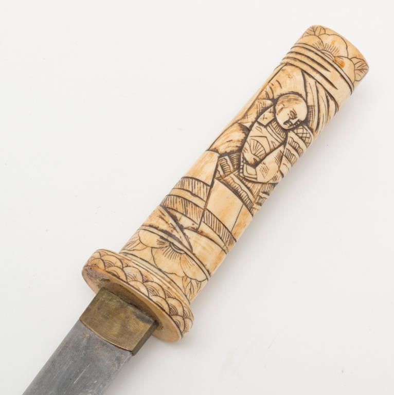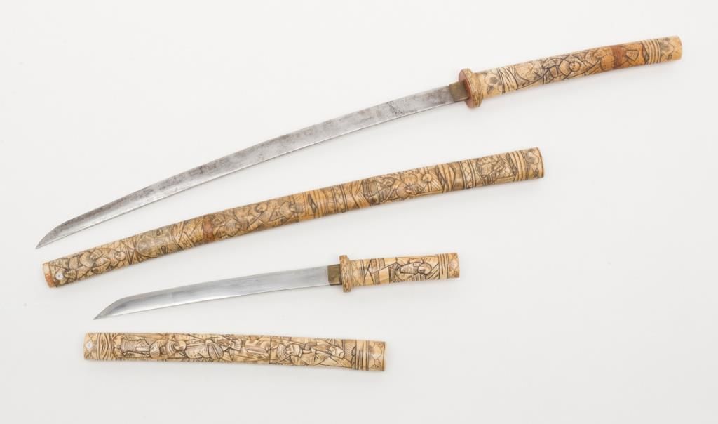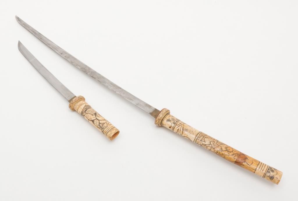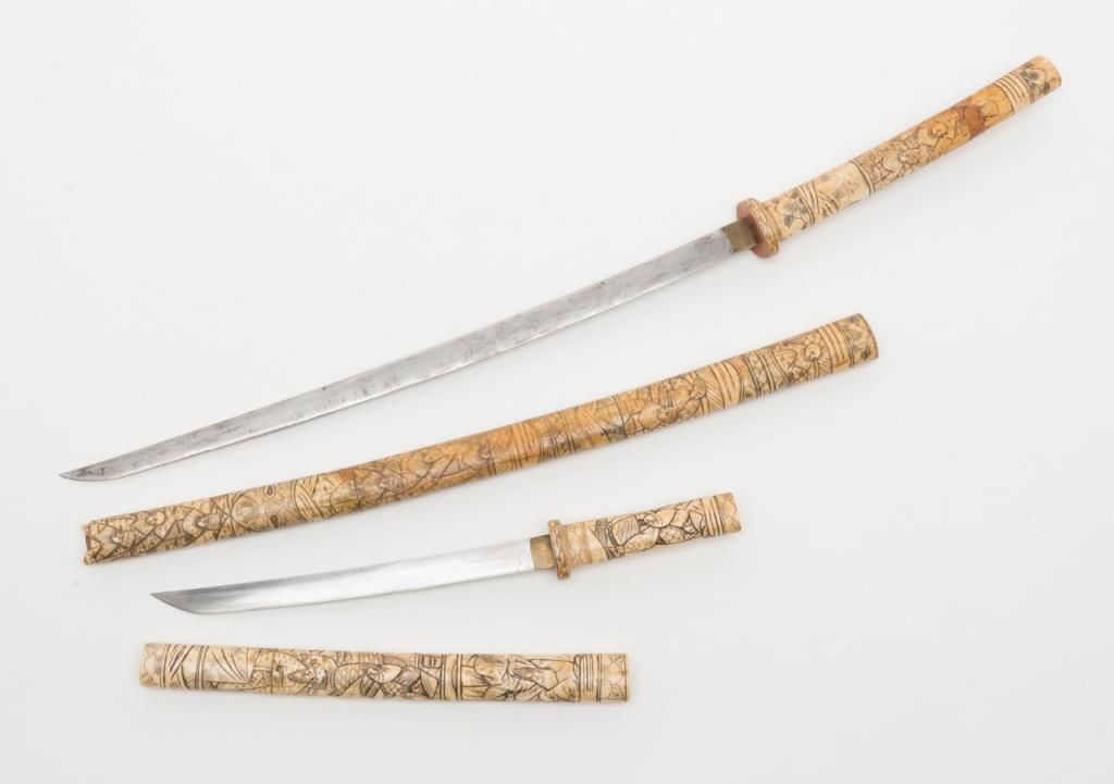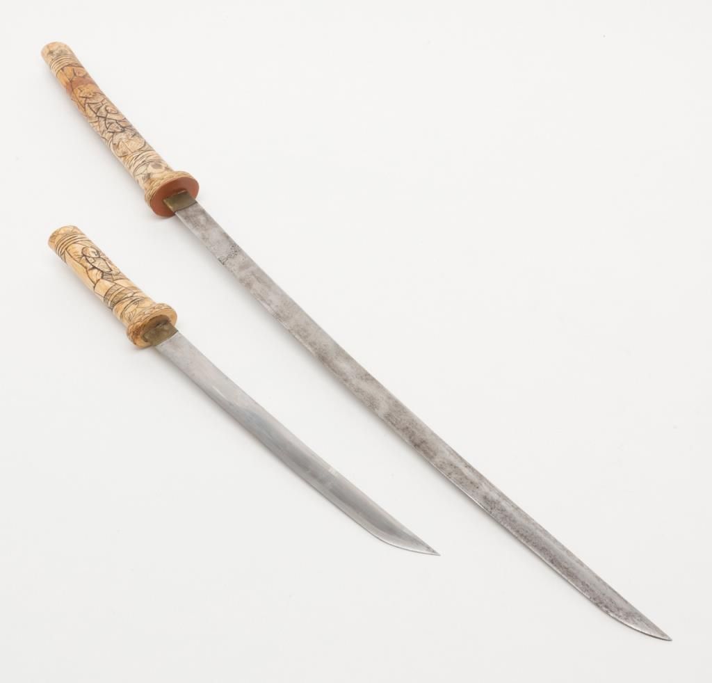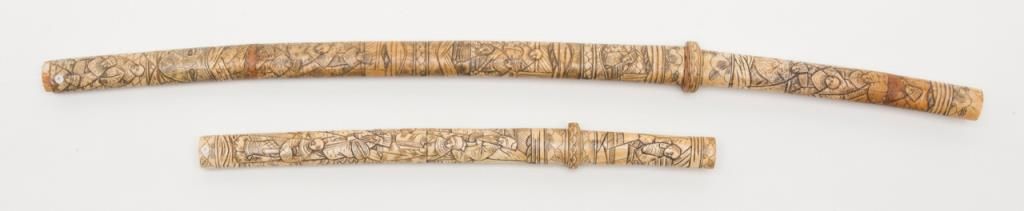 Lot of 2 carved bone Japanese swords including a “dagger” size, approx. 20” overall with a 12” blade in overall good condition with multiple figures of holy personages; the second sword is longer, approx. 37” overall with a 23” blade,matching motif; blade is fair + and there are some scattered spots of damage to the bone carvings including a loss at the bottom of the “scabbard”. This set definitely shows age and is not of recent vintage. Est.: $300-$500.