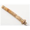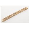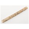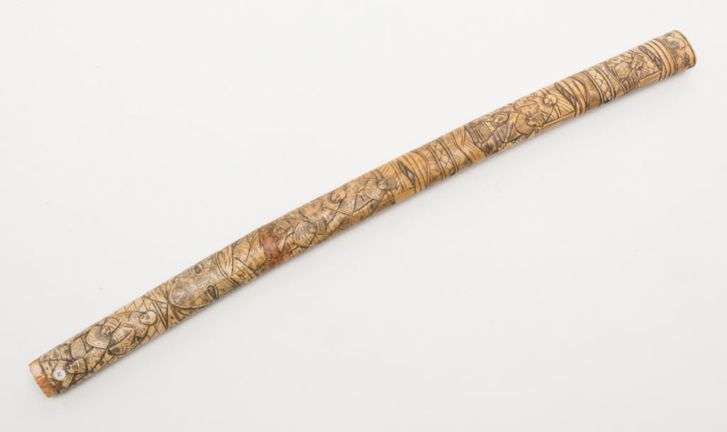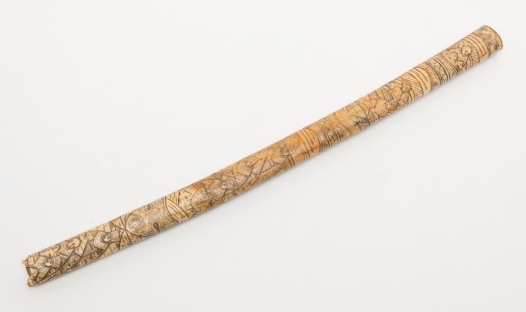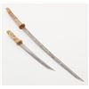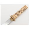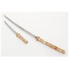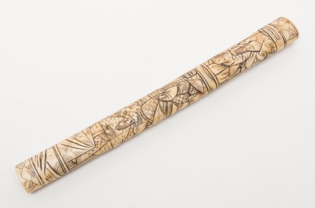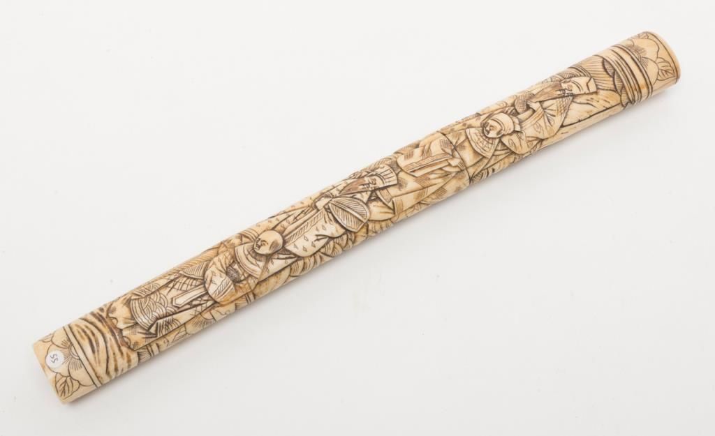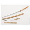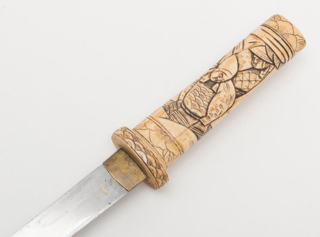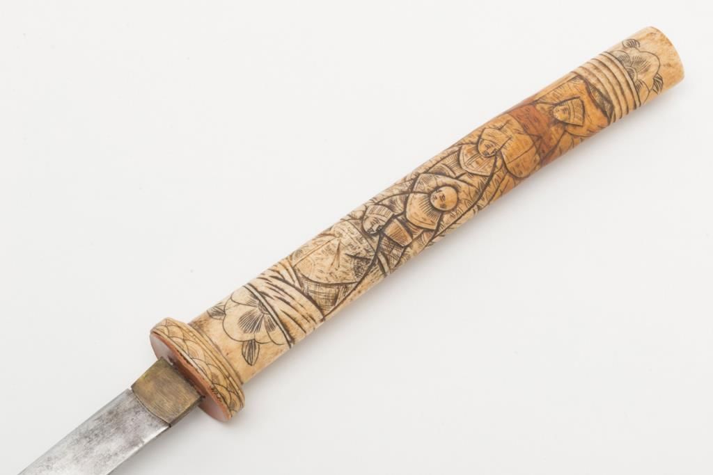 Lot of 2 carved bone Japanese swords including a “dagger” size, approx. 20” overall with a 12” blade in overall good condition with multiple figures of holy personages; the second sword is longer, approx. 37” overall with a 23” blade,matching motif; blade is fair + and there are some scattered spots of damage to the bone carvings including a loss at the bottom of the “scabbard”. This set definitely shows age and is not of recent vintage. Est.: $300-$500.