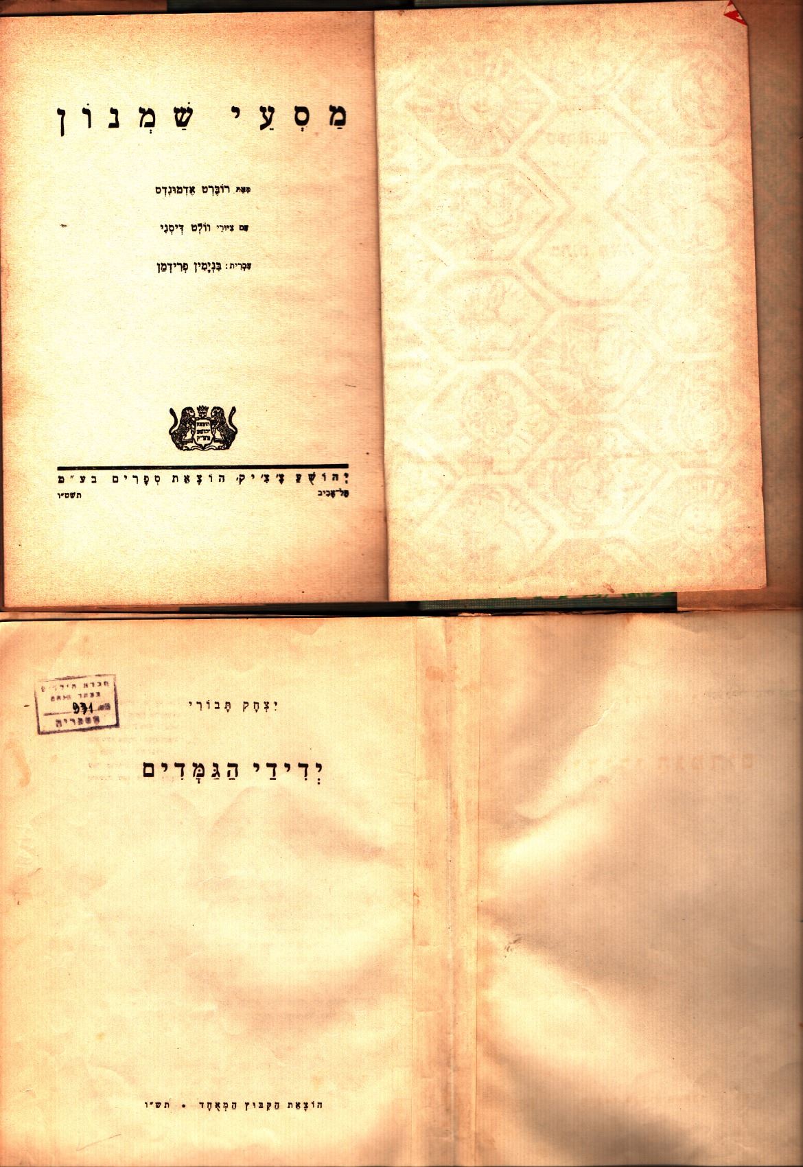 Lot of 2 chilren's books about dwarves: 1. Shmnun's Travels by Robert Edmonds, with Walt Disney pictures, Hakosem Library, published by Joshua Chachik, 1956, in good condition: dust jacket slightly flawed: tear in back, foldings on bottom, 2. Friends of the Dwarves by Yitzchak Tavori, HaKibbutz HaMeuchad, 1946, reasonable-good condition: binding reasonably worn, interior: a few folds, slightly yellowing.
