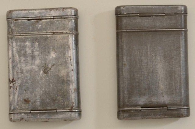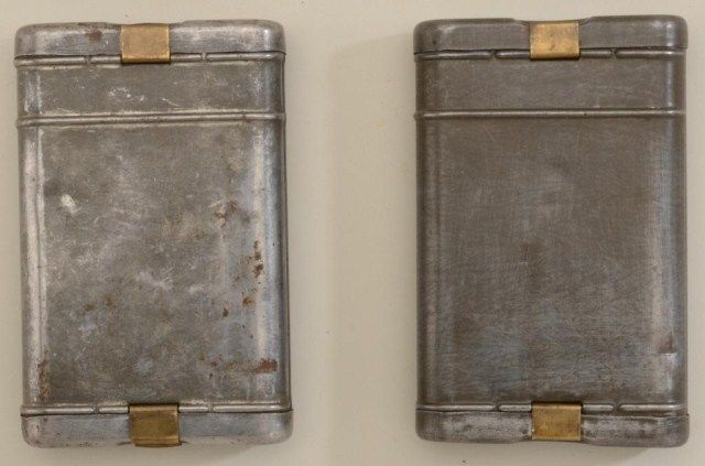 Lot of 2 cleaning kits for German Mauser rifles in metal canisters both in overall very good condition, one marked “G. Appel 1937” and the other marked “Ky 1937” and also nazi proofed with “WaA442”. Est.: $50-$75.
