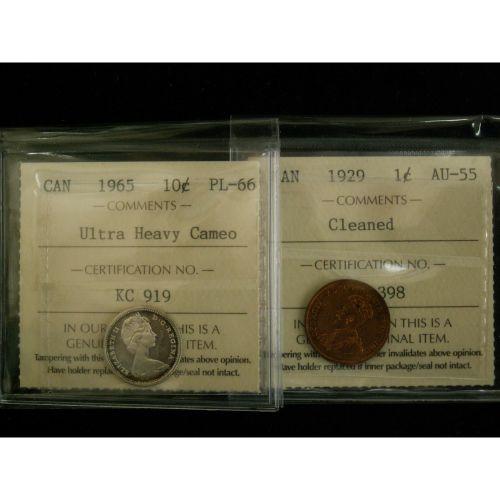 Lot of 2 coins; 1965 10¢ ICCS PL-66 Ultra Heavy Cameo, 1929 1¢ ICCS AU-55 cleaned,