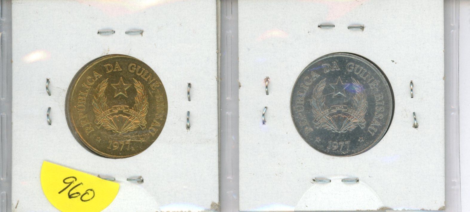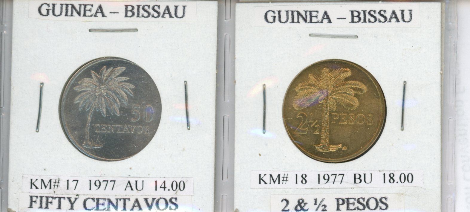Lot of 2 coins from Guinea-Bissau. 1977 50 centavos and 1977 2 ½ Pesos. First coinage of the new non-colonial government. Coins grade AU and BU. Hard to find coins from hard to find country in west Africa.