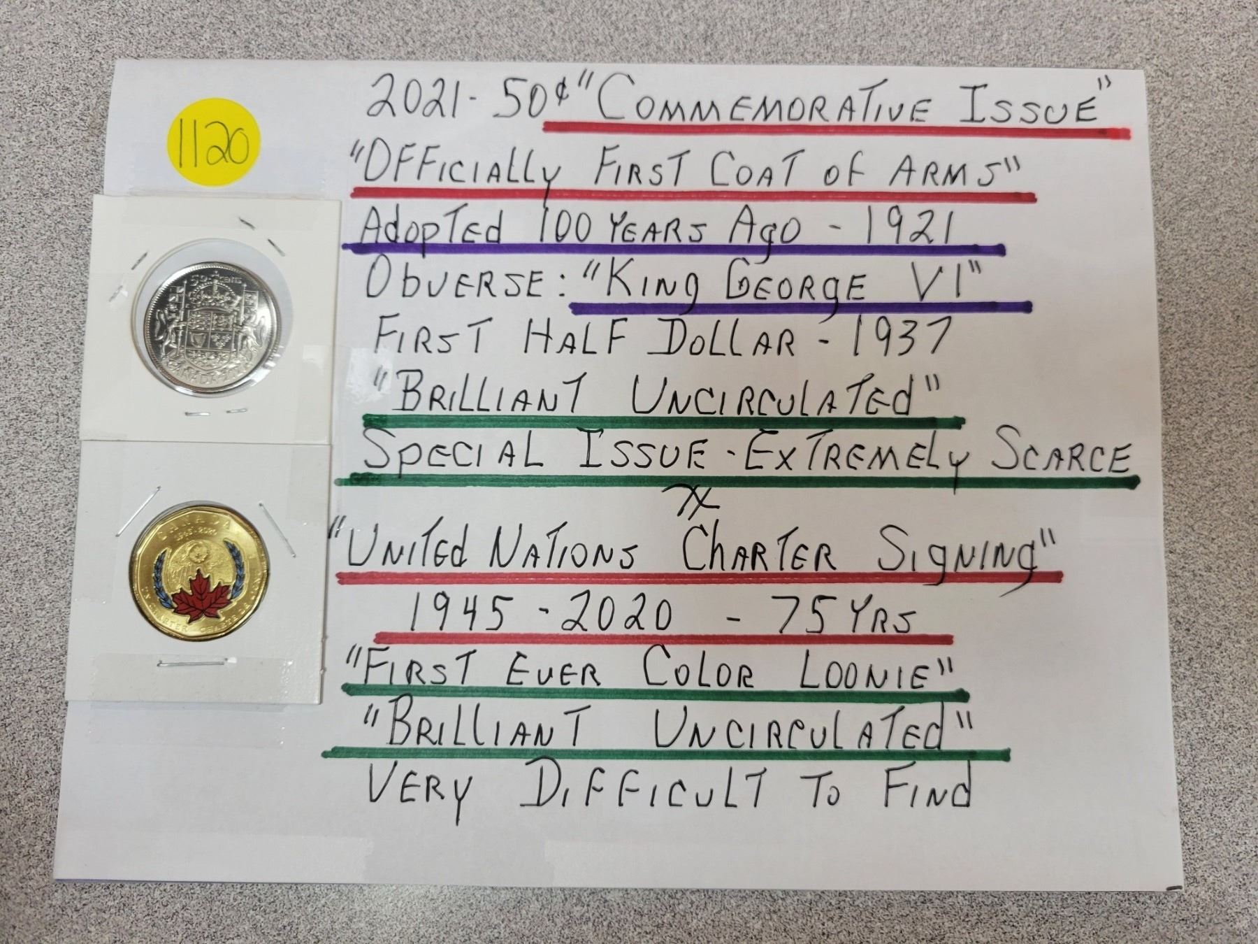 Lot of 2 commemorative Canadian coins - 2021 50¢& 1945-2020 First ever color loonie