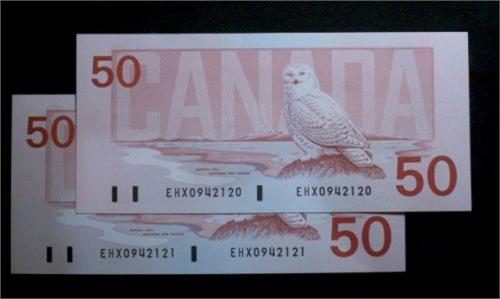 Lot of 2 consecutive BC-59aA 1988 $50 EHX0942120 and 121. Below 1,7M. Scarce. Both Gem!