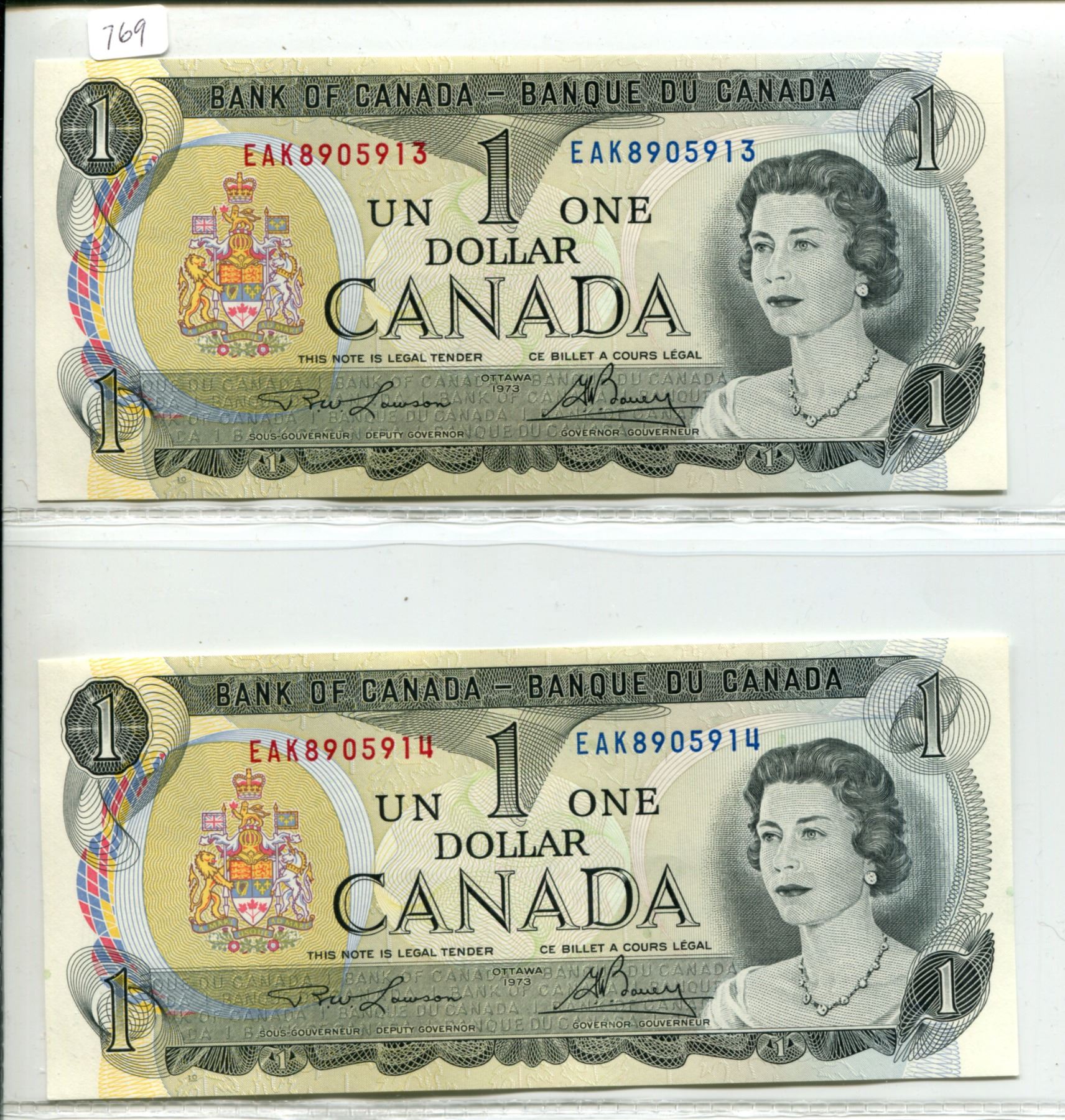 Lot of 2 consecutive Serial Number 1973 $1 Notes. Lawson-Bouey signatures. EAK Prefix. Serial Numbers 8905913 & 8905914.