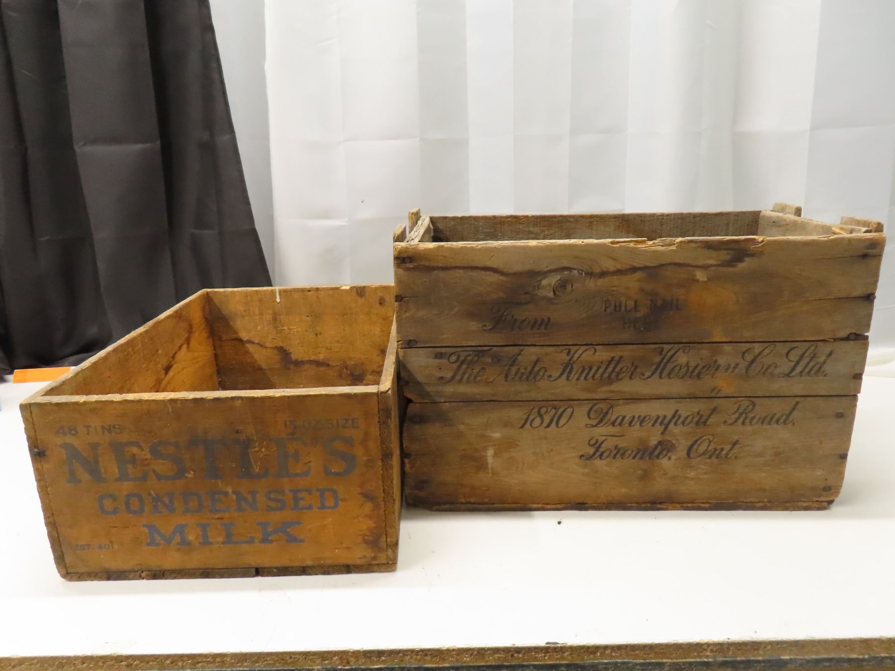 Lot of 2 (crates) -48 tin nestles condensed milk and the auto knitter hostery co.ltd.