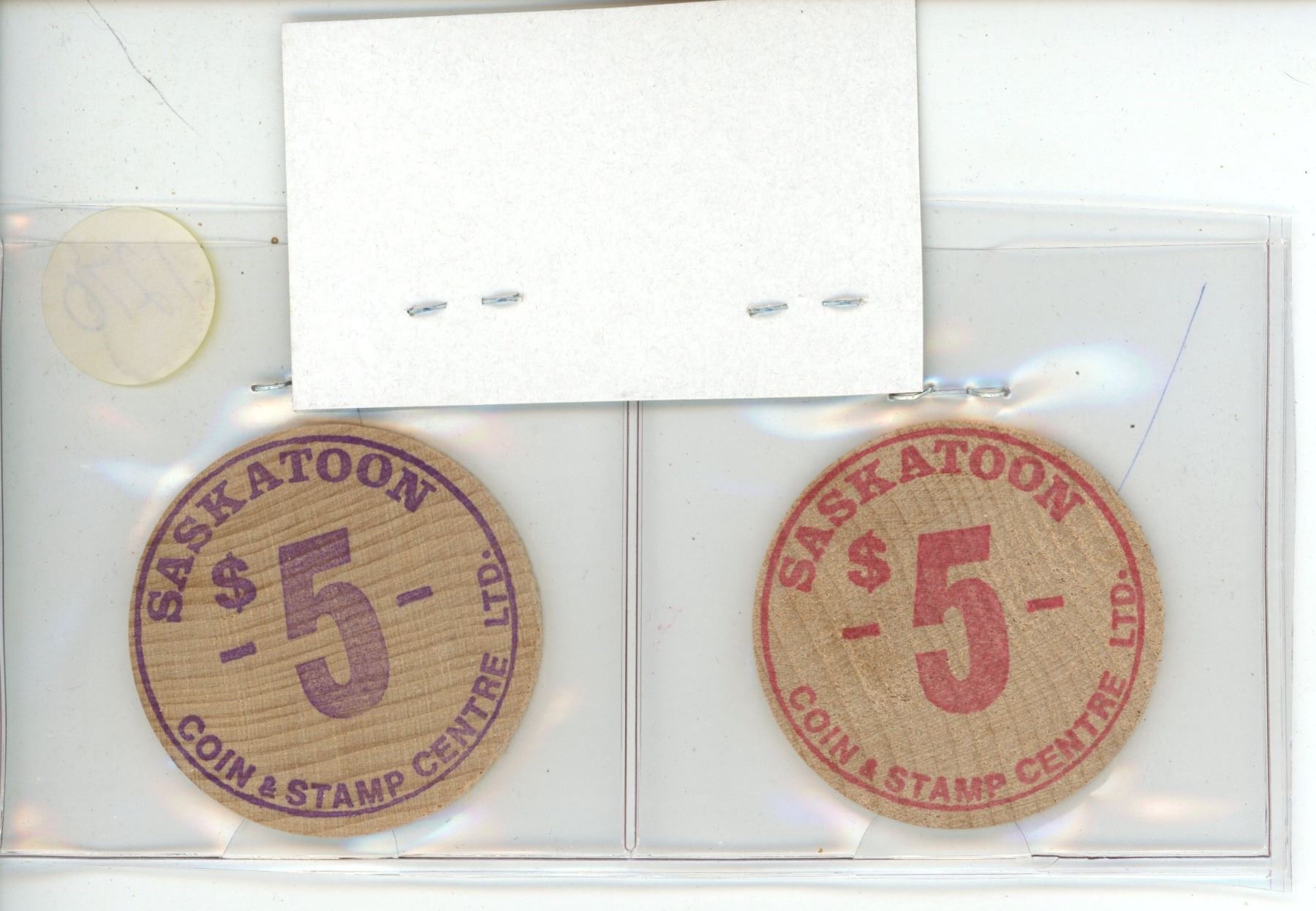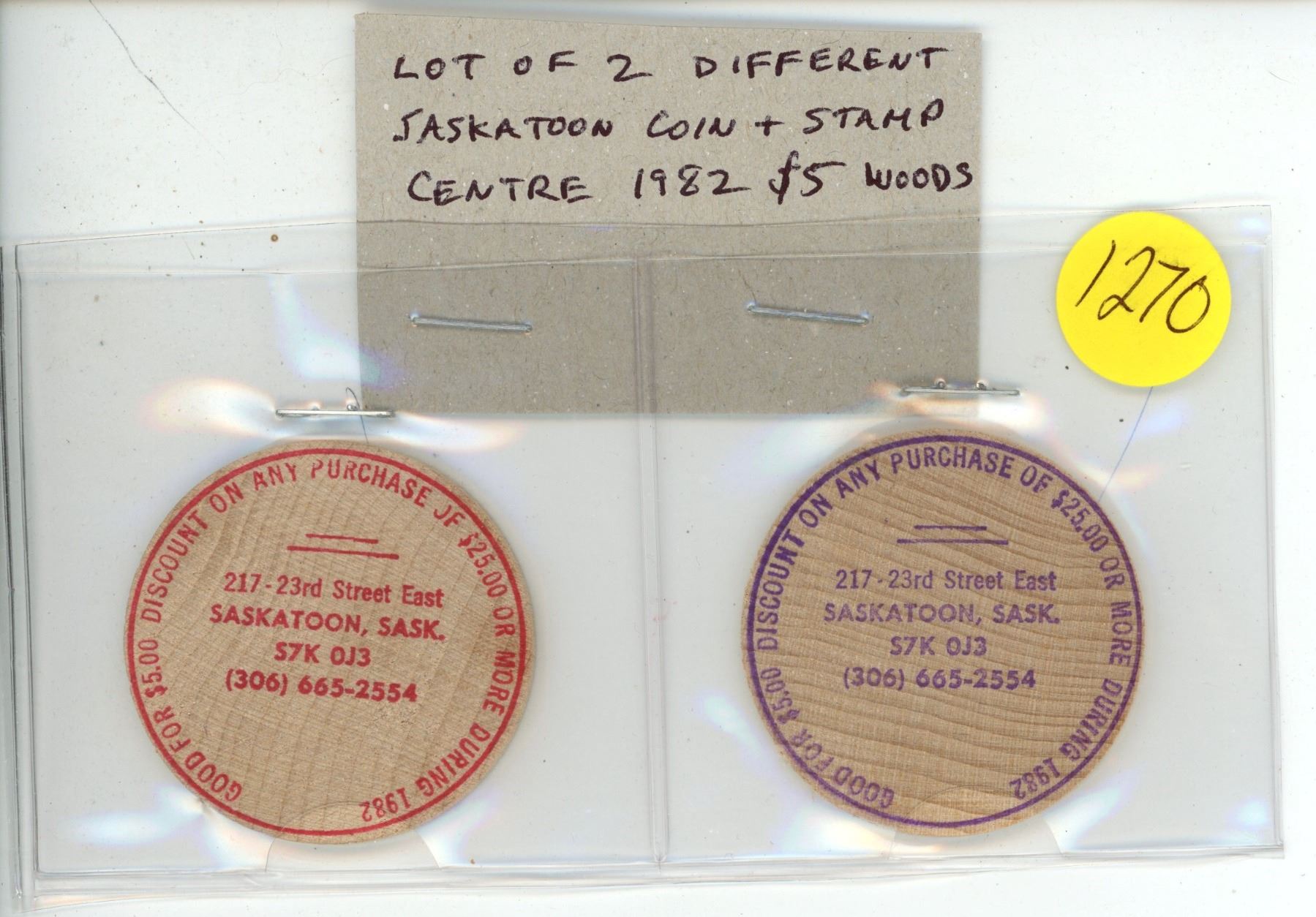 Lot of 2 different 1982 Saskatoon Coin & Stamp Centre 2-inch woods. One in Red, the other in Purple. Both are good for $5 discount.